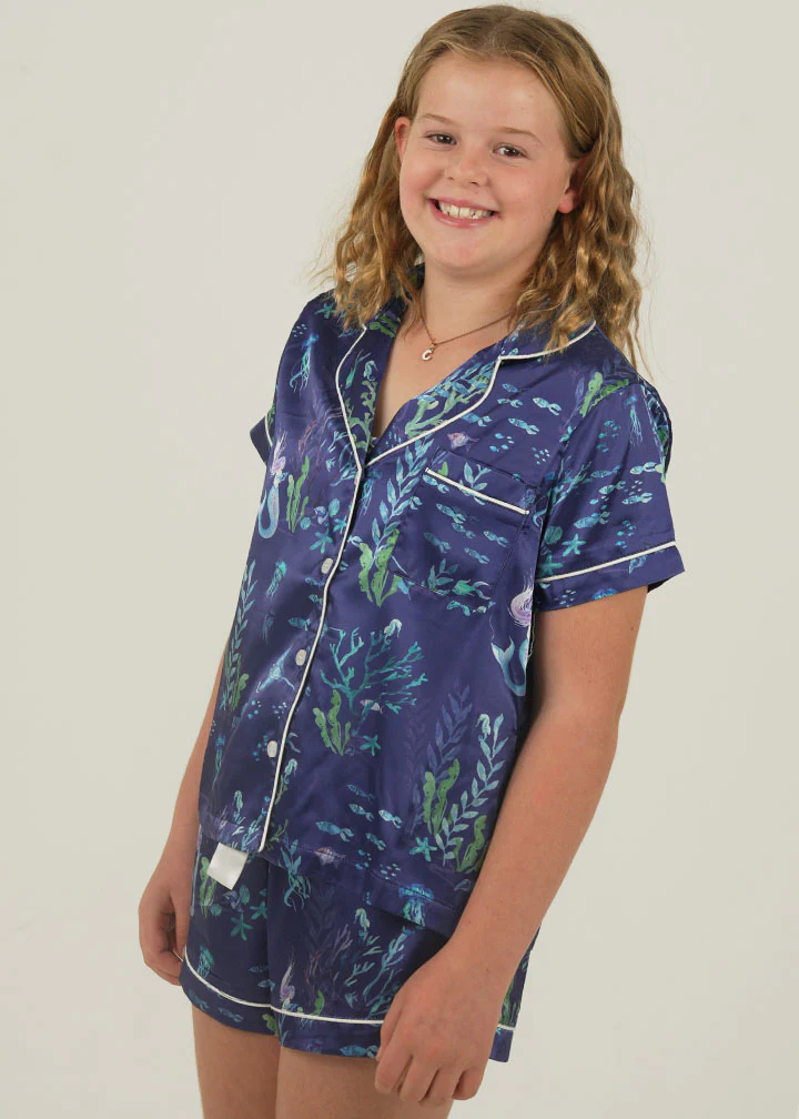 Be captivated by the magic of the underwater world with our Deep Sea Satin Pyjamas. Lovingly detailed with deep pockets, adorable buttons, and an extra stretchy drawstring waistband for the ultimate comfort experience.