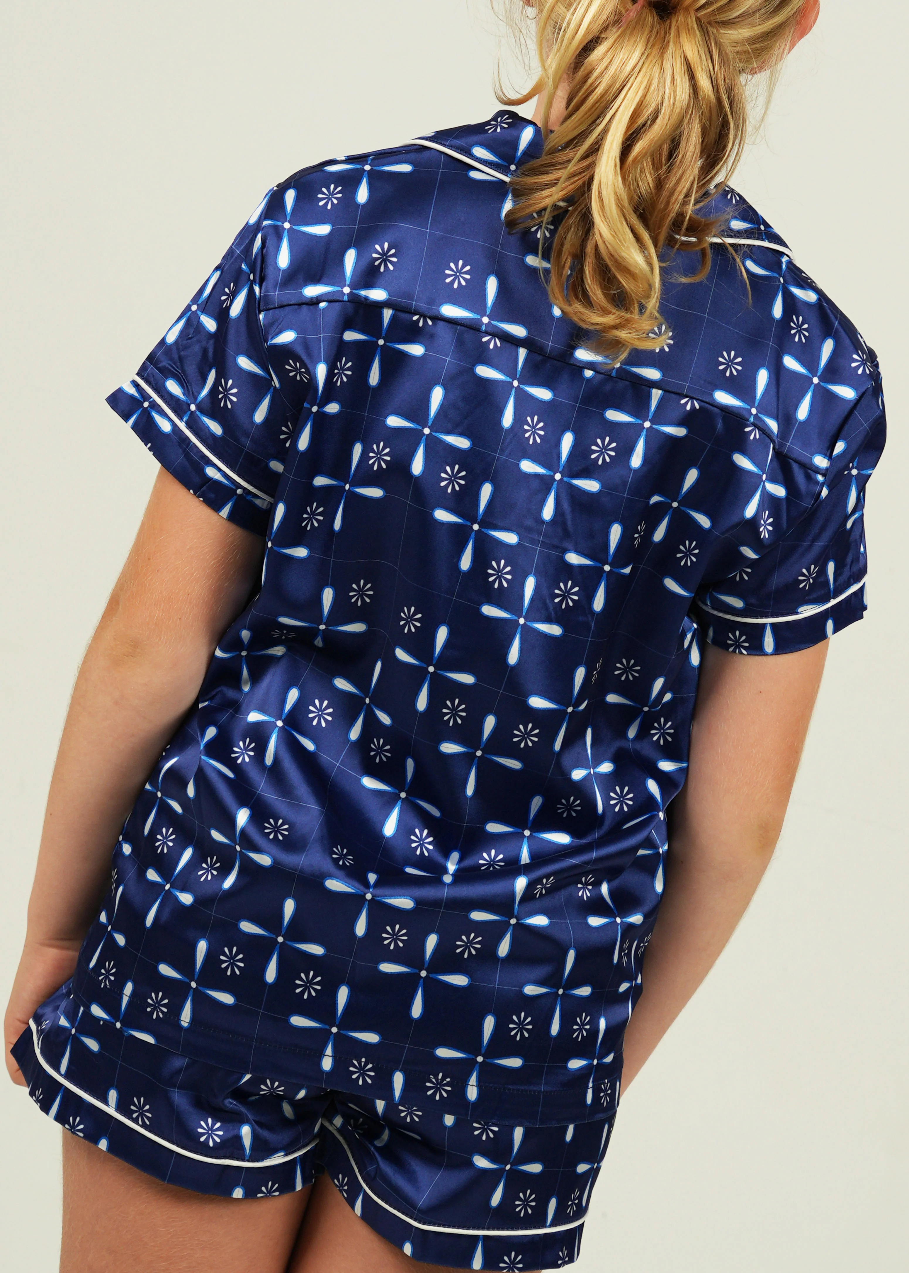 Lay all your love on our gorgeous Seaside Navy Satin Pyjamas. It’s giving Sophie from Mamma Mia and with an extra stretchy waistband, deep pockets and and the silkiest satin fabric, you’ll feel like you’re lying on the soft golden sands of Kalokairi.