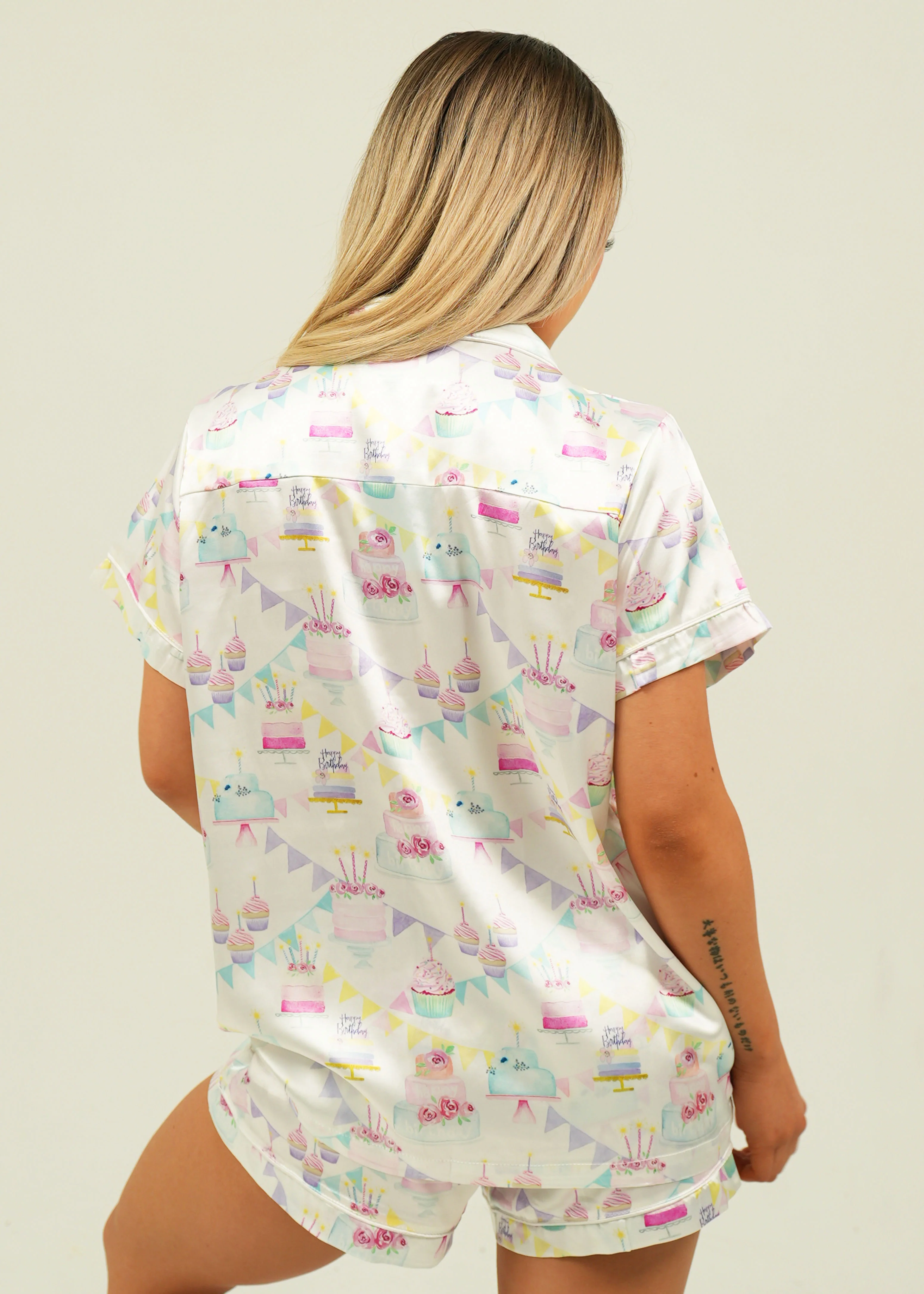 Celebrate in style with our festive Satin Birthday Pyjamas. Whether on your special day or just for fun, our Birthday set will make every moment a little brighter. Lovingly detailed with deep pockets, adorable buttons, and an extra stretchy drawstring waistband for the ultimate comfort experience.